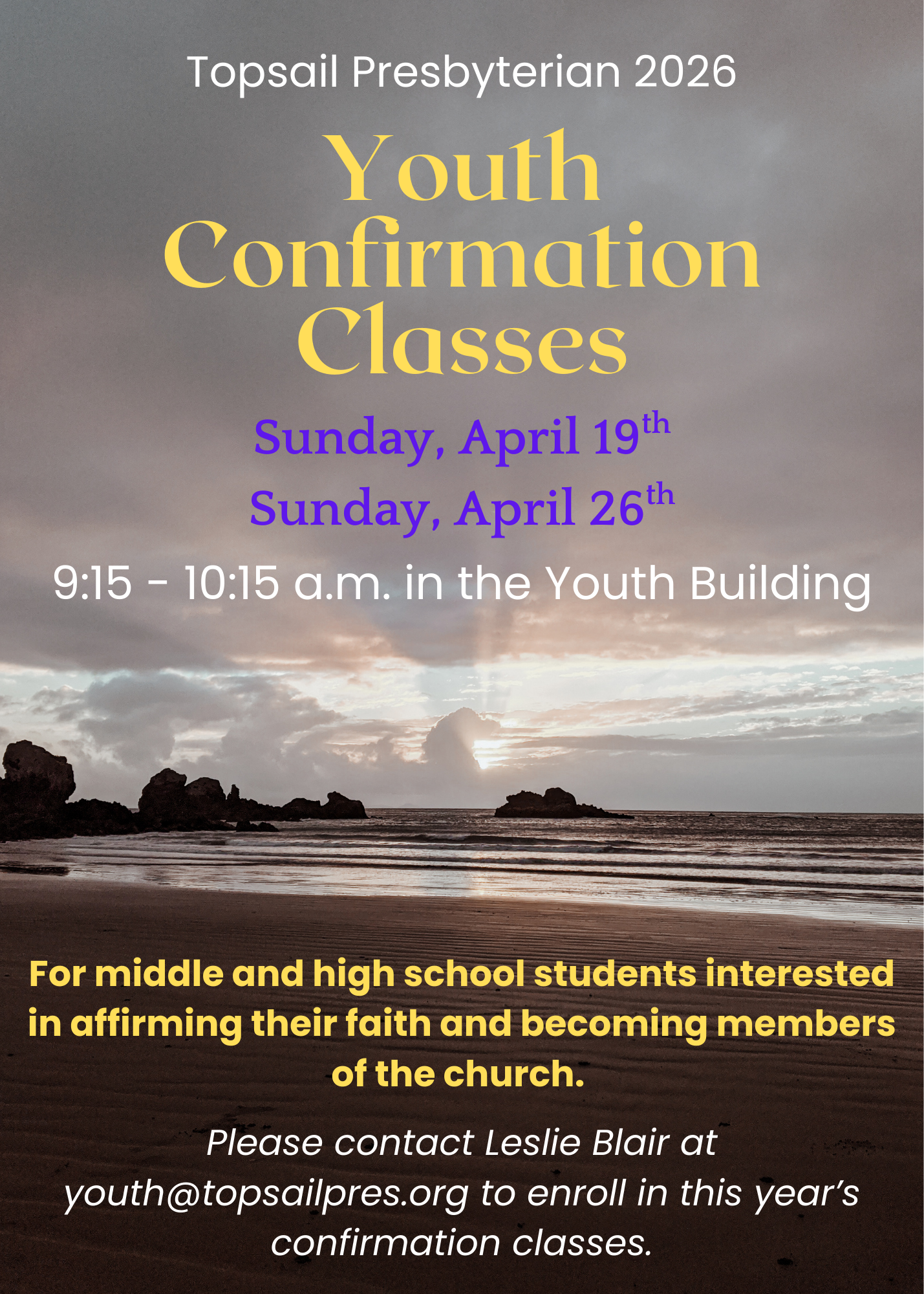 Youth Sunday School is offered each Sunday during the 10:30am worship service. Participating students are excused from the worship service following the Children’s sermon and reconnect with their parents at the conclusion of the service.